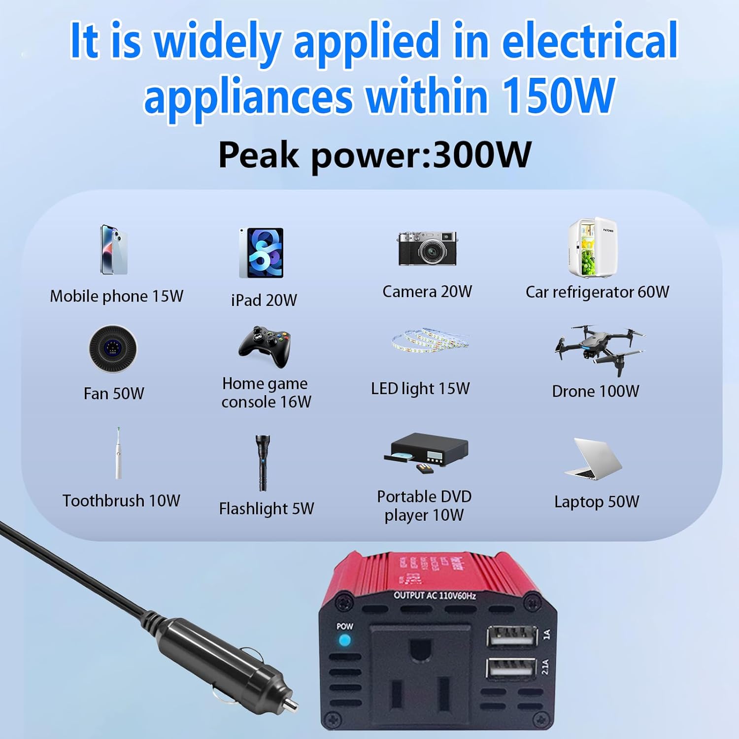 - โLimited to 150W power output for larger appliances