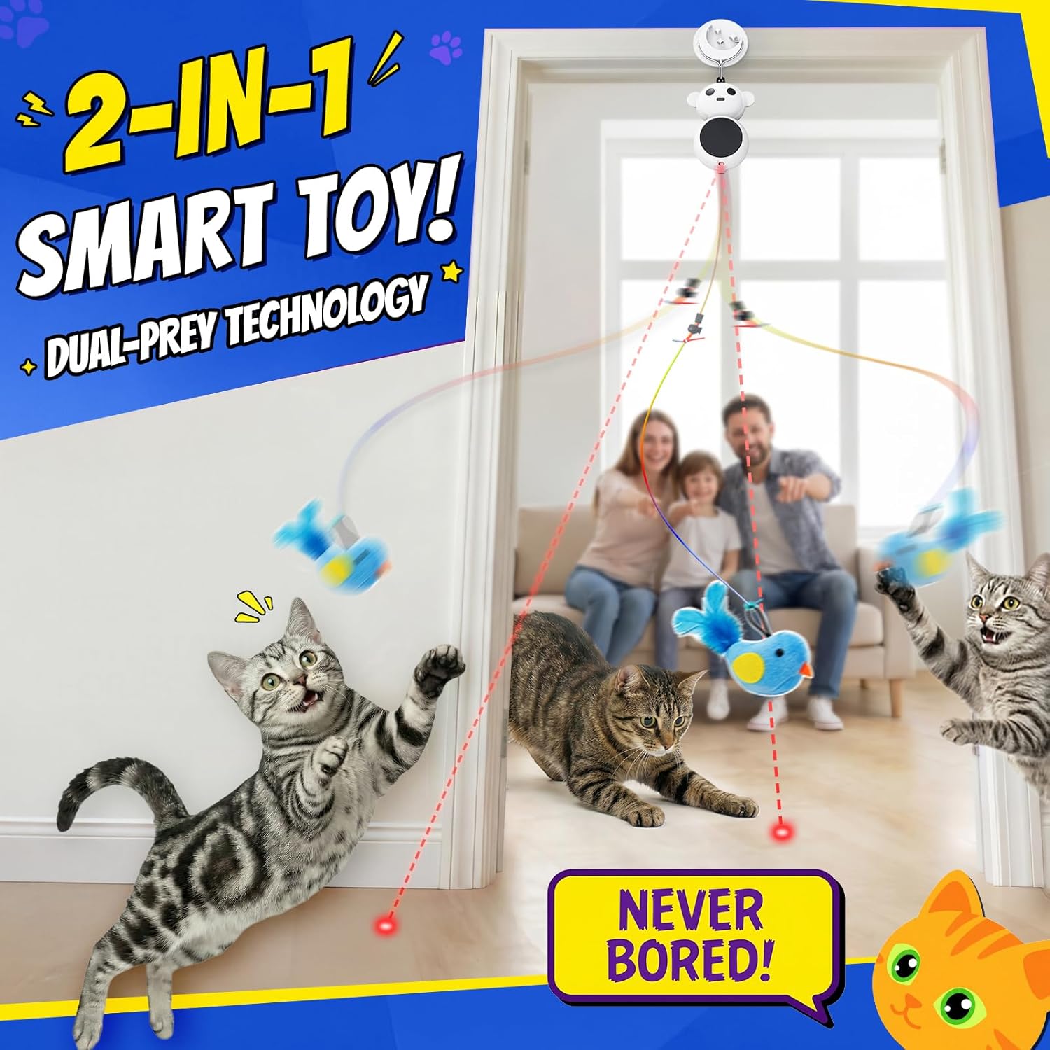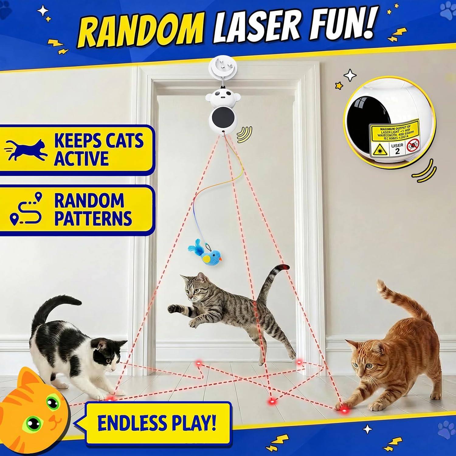 - β’Dual entertainment with spinning laser dot and swinging feather toy
