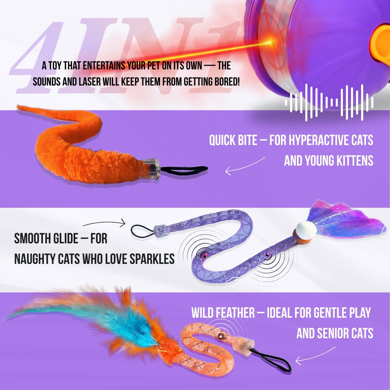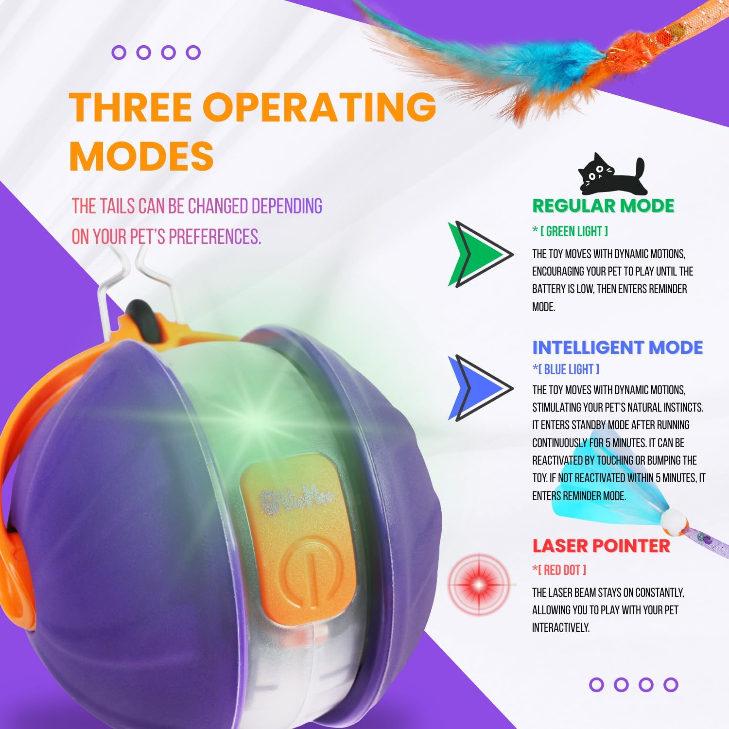 Cat Laser Toy Automatic 4-in-1, Interactive Ball & Laser Pointer for Indoor Cats with 3 Interchangeable Tails, Rechargeable Teasing Pet Toy for Kittens & Adults