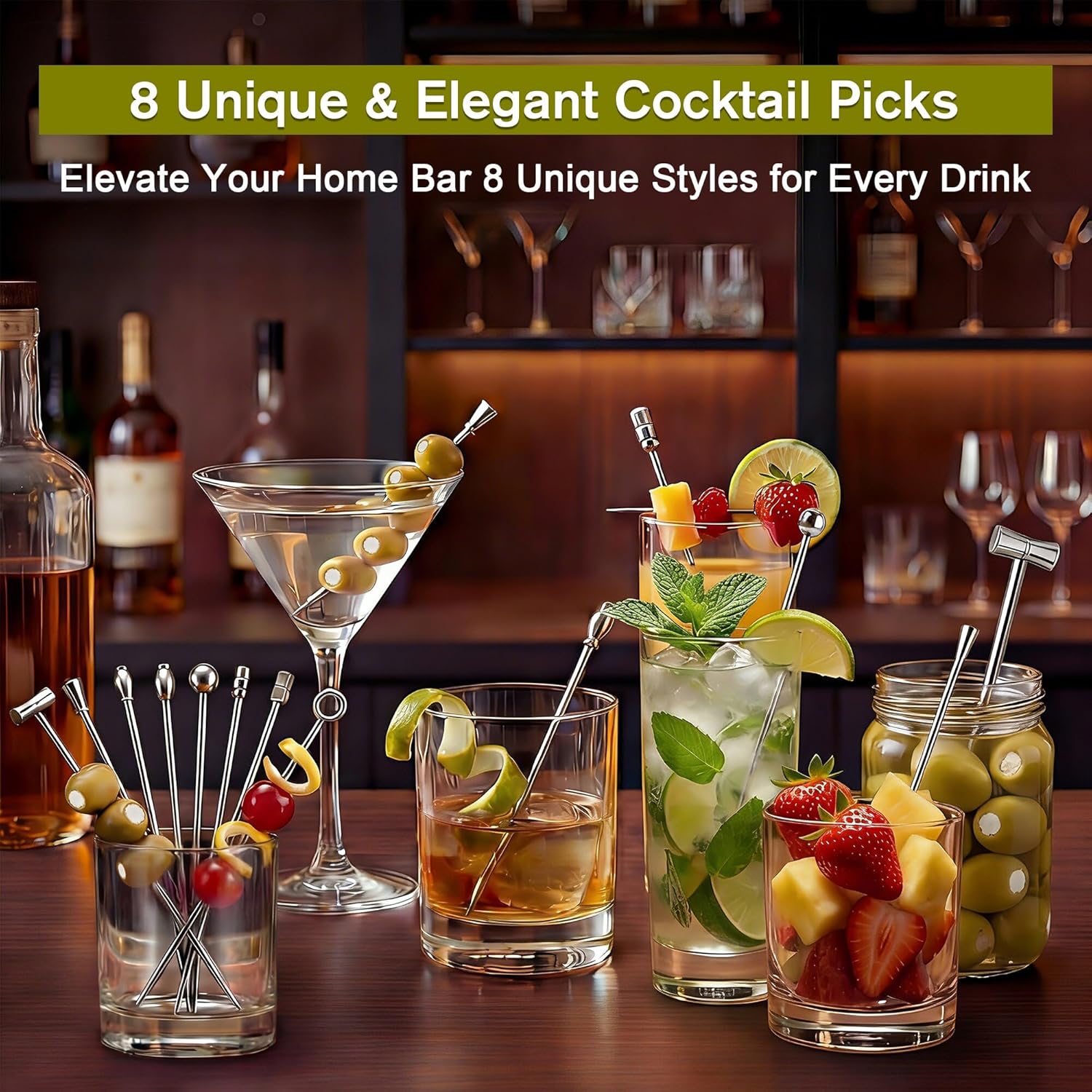 - โขEight steel picks with varied decorative tops for style and drink identification